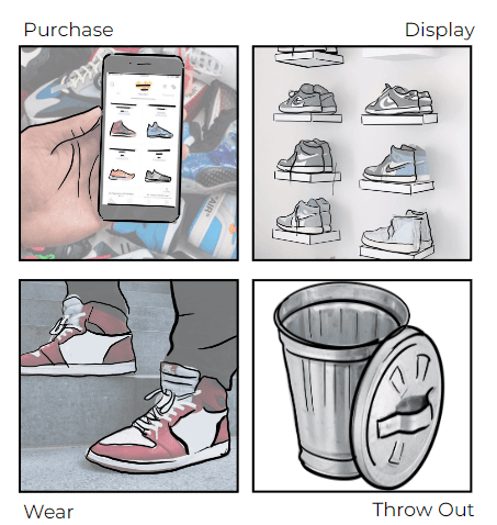 The brief: design a product that follows a circular lifecycle. Something taken from the earth that could, eventually, return to it. Finding the right problem meant looking for products that do the opposite. Footwear kept coming up. The sole specifically, rubber and petroleum-based foam that doesn't break down, doesn't decompose, and sits in landfill for centuries long after the shoe itself is forgotten. The user group that makes this most visible is sneakerheads. A culture built on accumulation. New pairs in, old pairs out, with little thought for what comes next. The problem wasn't just material. It was behavioural. And any solution that ignored that was never going to work.