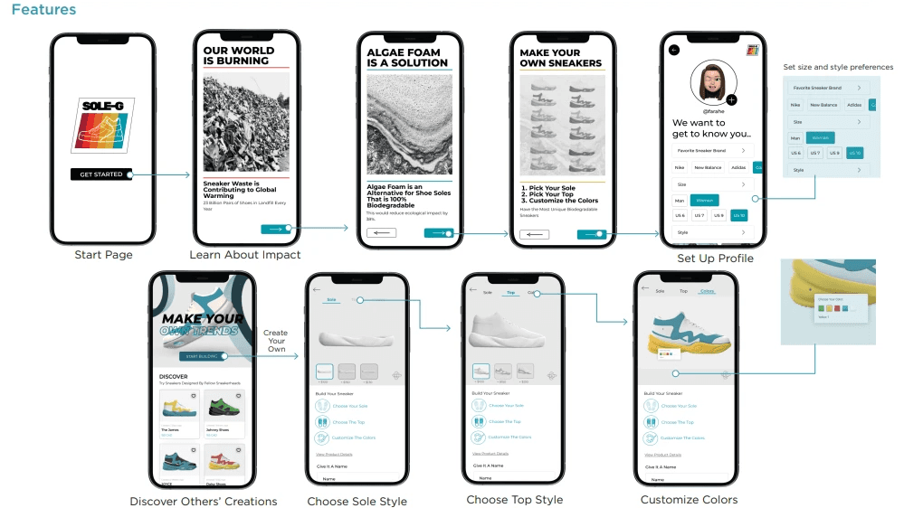 That meant designing both the shoe and the experience around it. SOLE-G became a customisation platform built on a circular foundation: a shoe constructed with an algae-based sole, paired with an application that lets users design their own pair from the ground up. Sustainability as the structure. Self-expression as the surface.